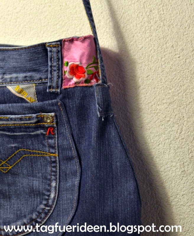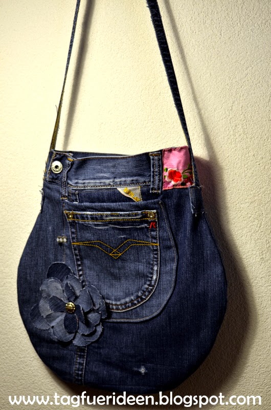 Vielleicht noch ein buntes Tuch an den Träger, dann wird es richtig hippiemäßig, wie sich das für eine Jeanstasche gehörtf! 😉Liebe Grüße