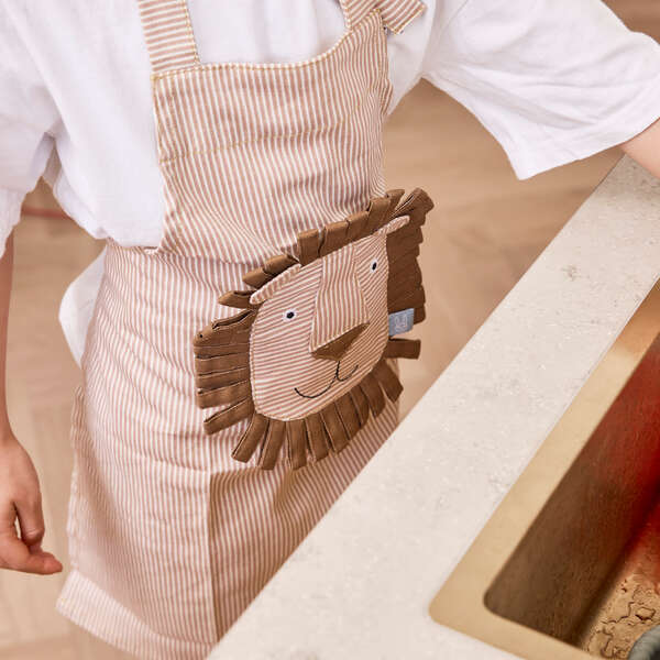 Die gestreifte Denim-Löwen-Schürze ist eine lustige und verspielte Schürze, die für Kinder entworfen wurde.