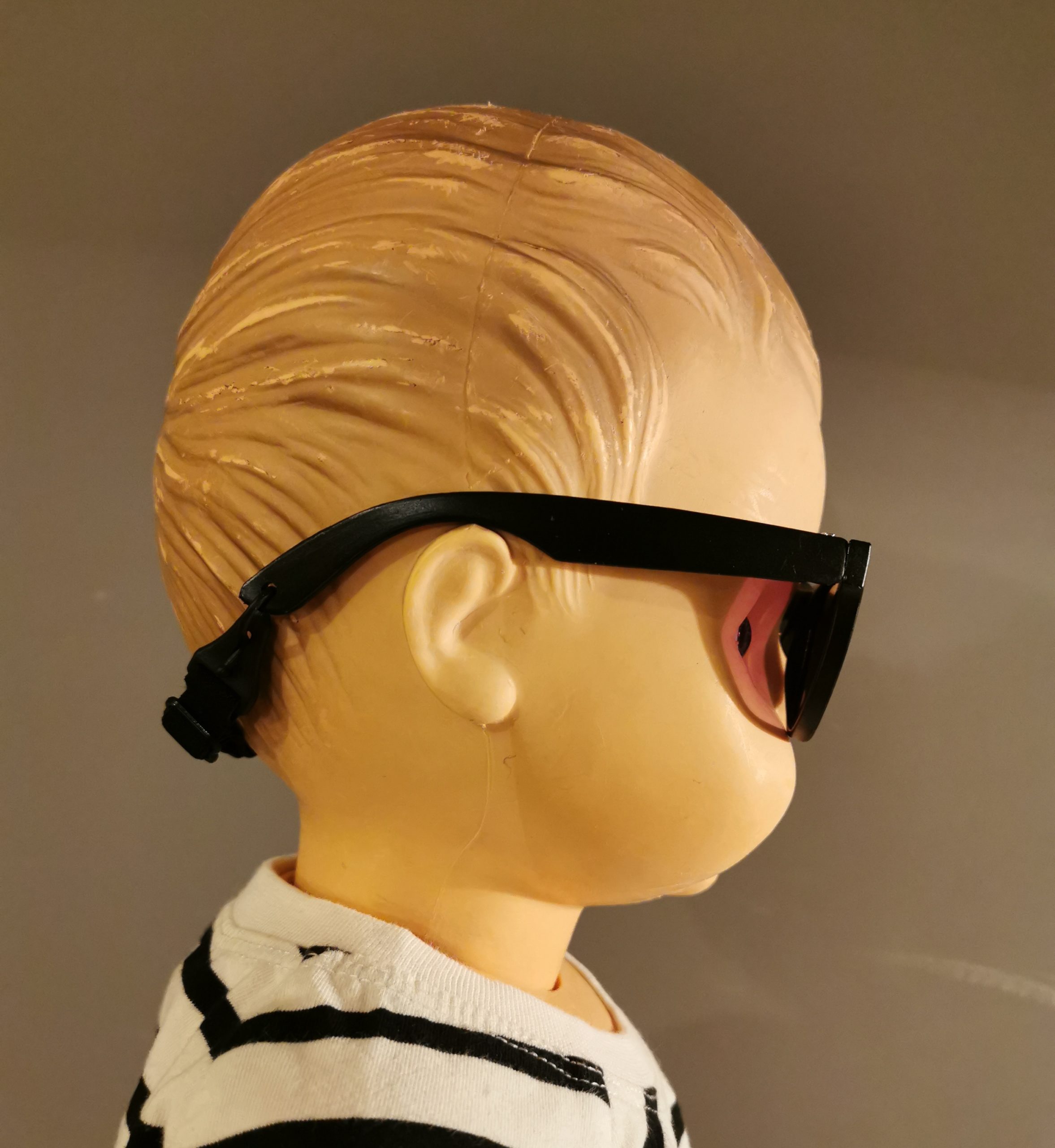 Das Gestell ist weich, und die Bügel überdehnbar. Das praktische elastisches Band, das um den Kopf gelegt werden kann, hält die Brille an Ort und Stelle. Das Band ist durch eine kleine Schnalle am Brillengestell abnehmbar und für eine perfekte Passform verstellbar. Frei von BPA, Schwermetallen und schädlichen Chemikalien. Sie bietet 100% UV-Schutz, ist langlebig und weich.
