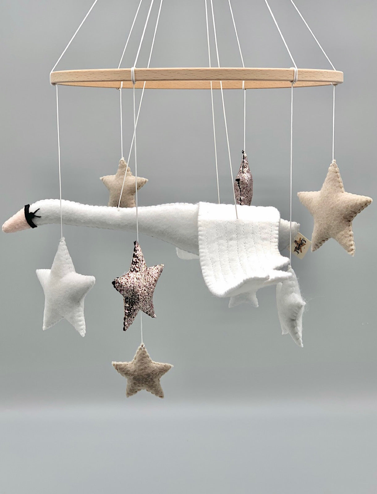 Das Gänsemobile bringt Eleganz in das Kinderzimmer.