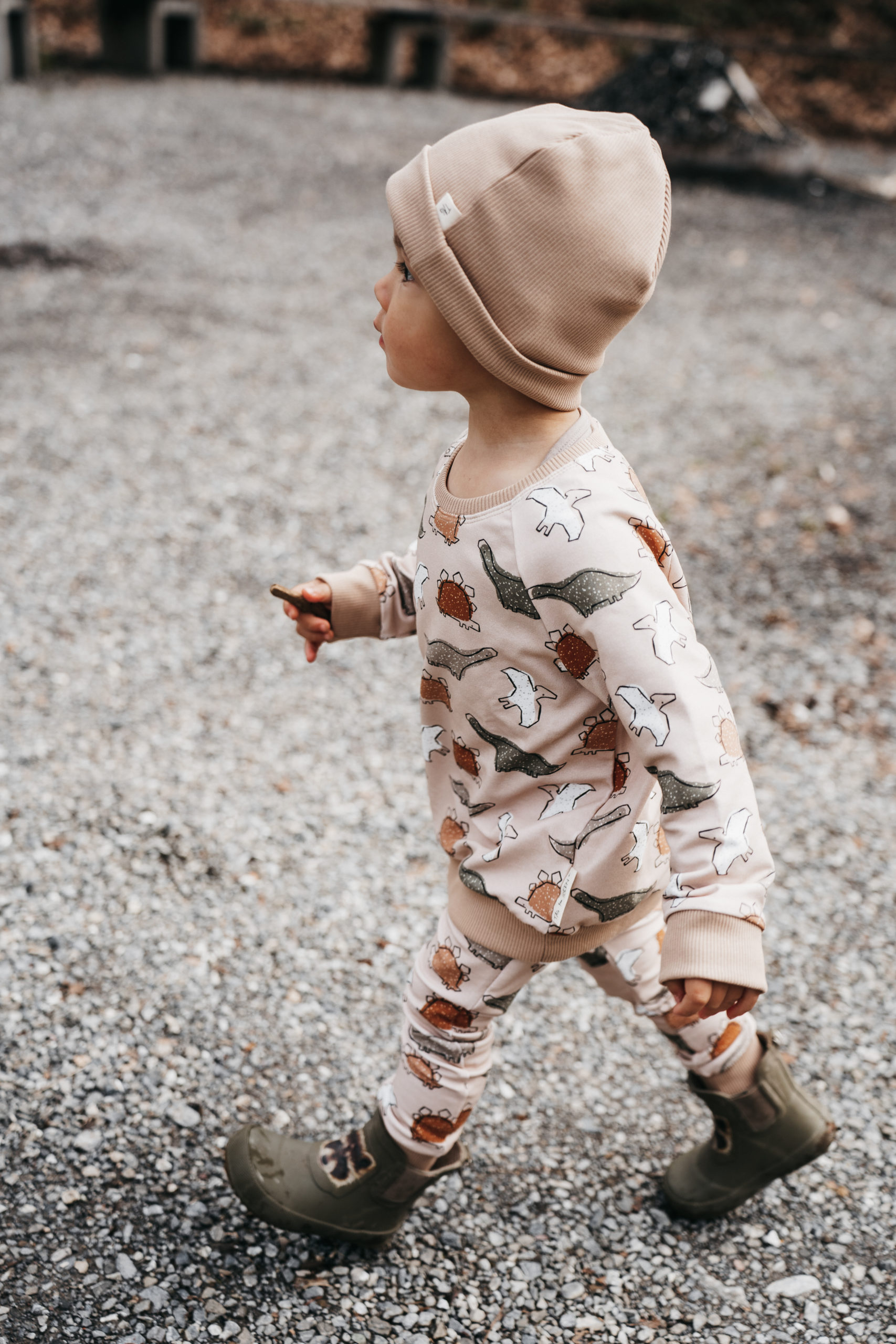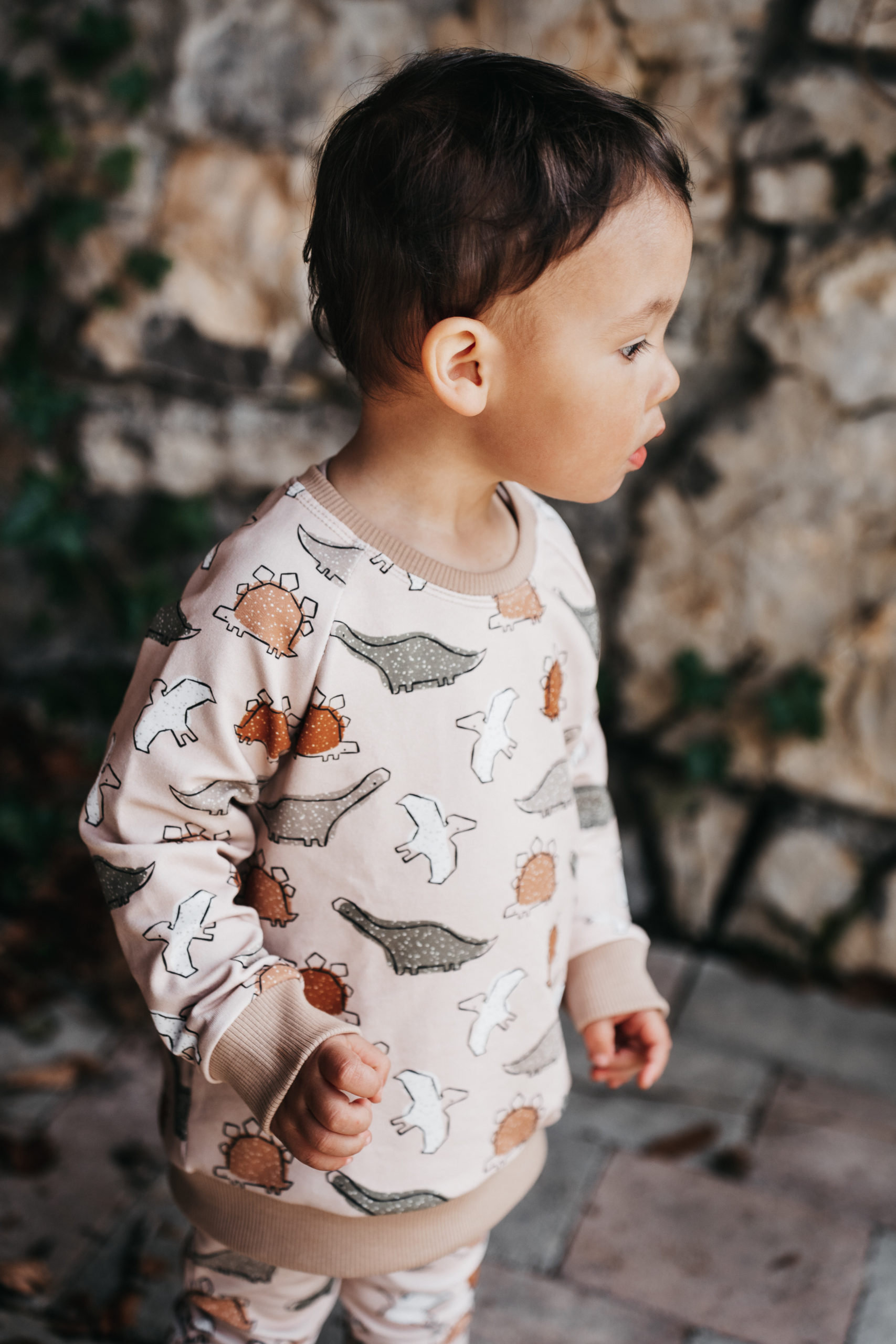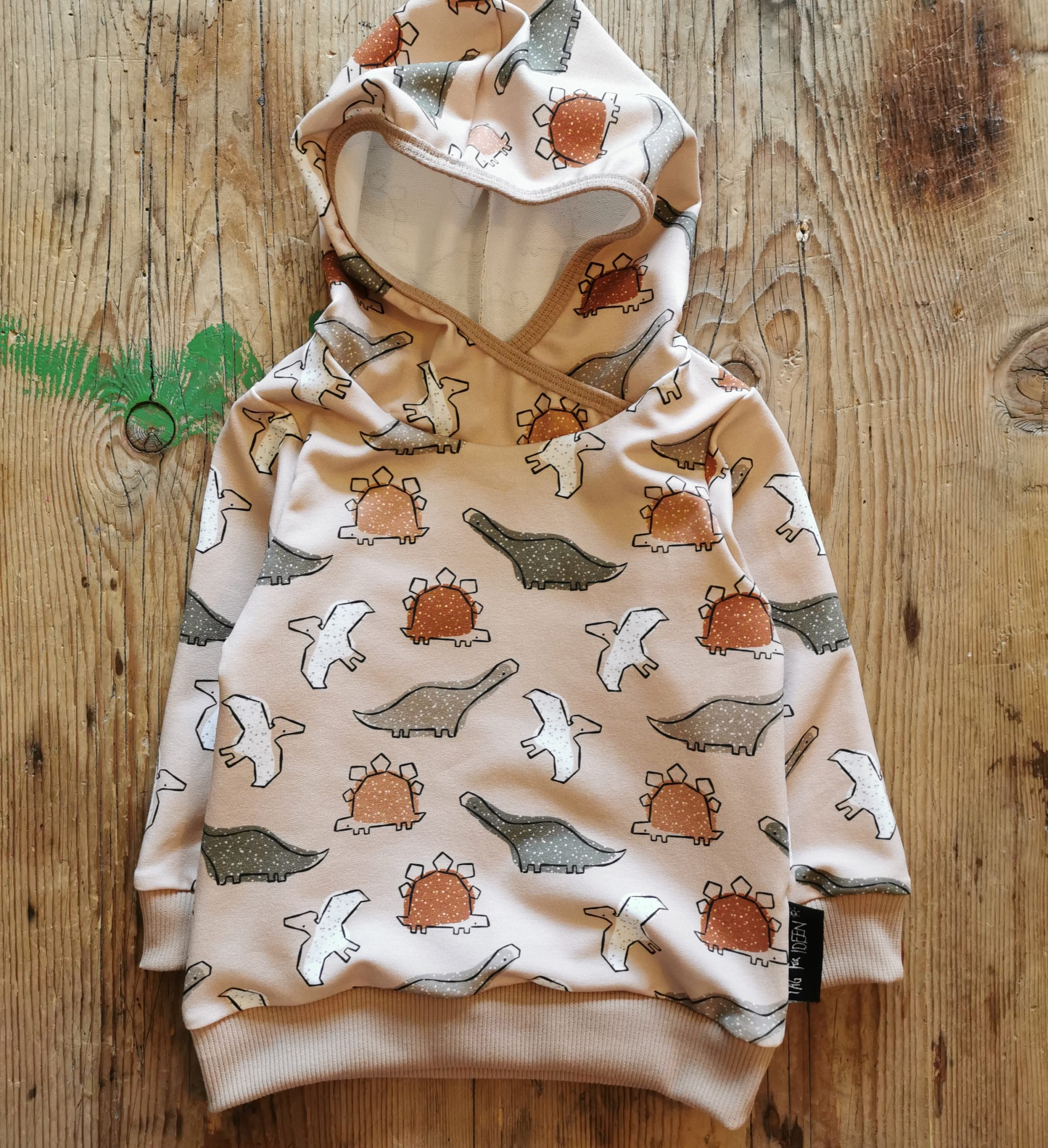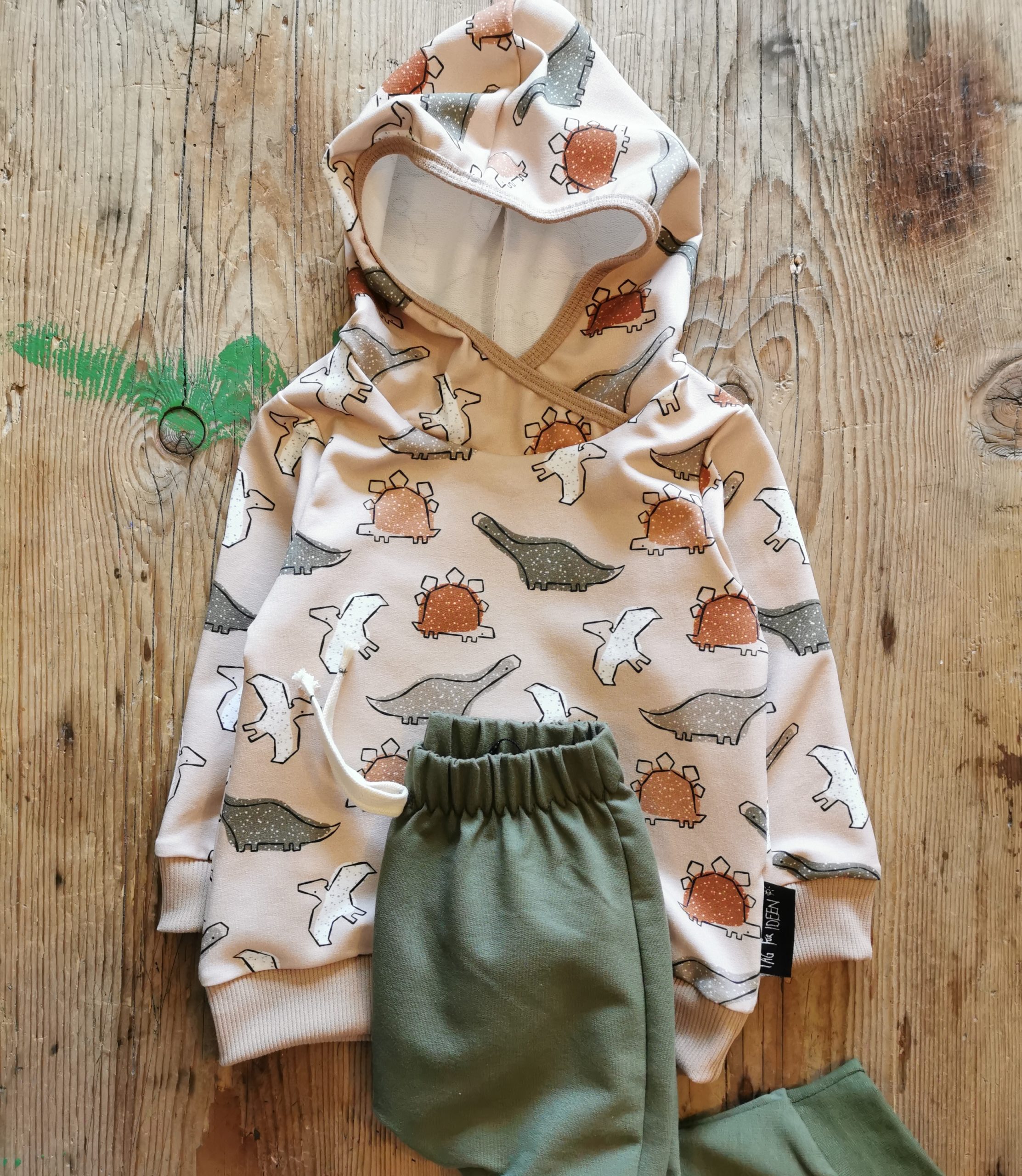 Eigenproduktion Dino-Sommersweat: 95% Baumwolle, 5 % Elasthan in Bio-Qualität bedruckt mit Bio-Farben