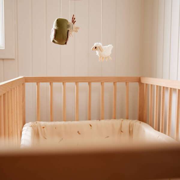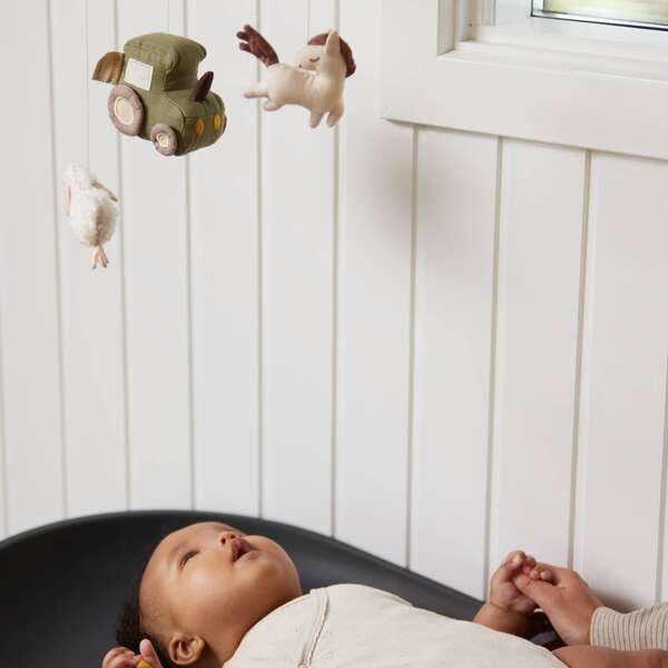Das süße Mobile besteht aus Leinenstoff und setzt sich aus einem Buchenholzring mit einem niedlichen kleinen Traktor, einem flauschigen Schaf und einem eleganten Pferd zusammen.