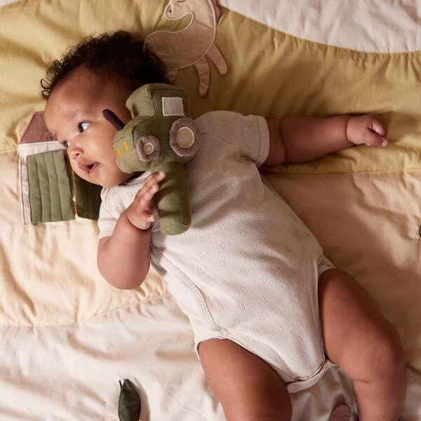 Der bunte Traktor wird schnell das Interesse Ihres Babys wecken und bietet viele feine Details, die kleine Hände unbedingt erkunden müssen. Alle kleinen Details sind natürlich auf das Spielzeug gestickt, sodass Sie sich keine Sorgen um Kleinteile machen müssen.