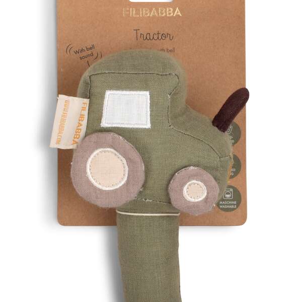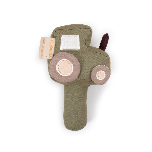 Dieses süße kleine Traktor-Rasselspielzeug ist aus weichem Leinenstoff gefertigt.