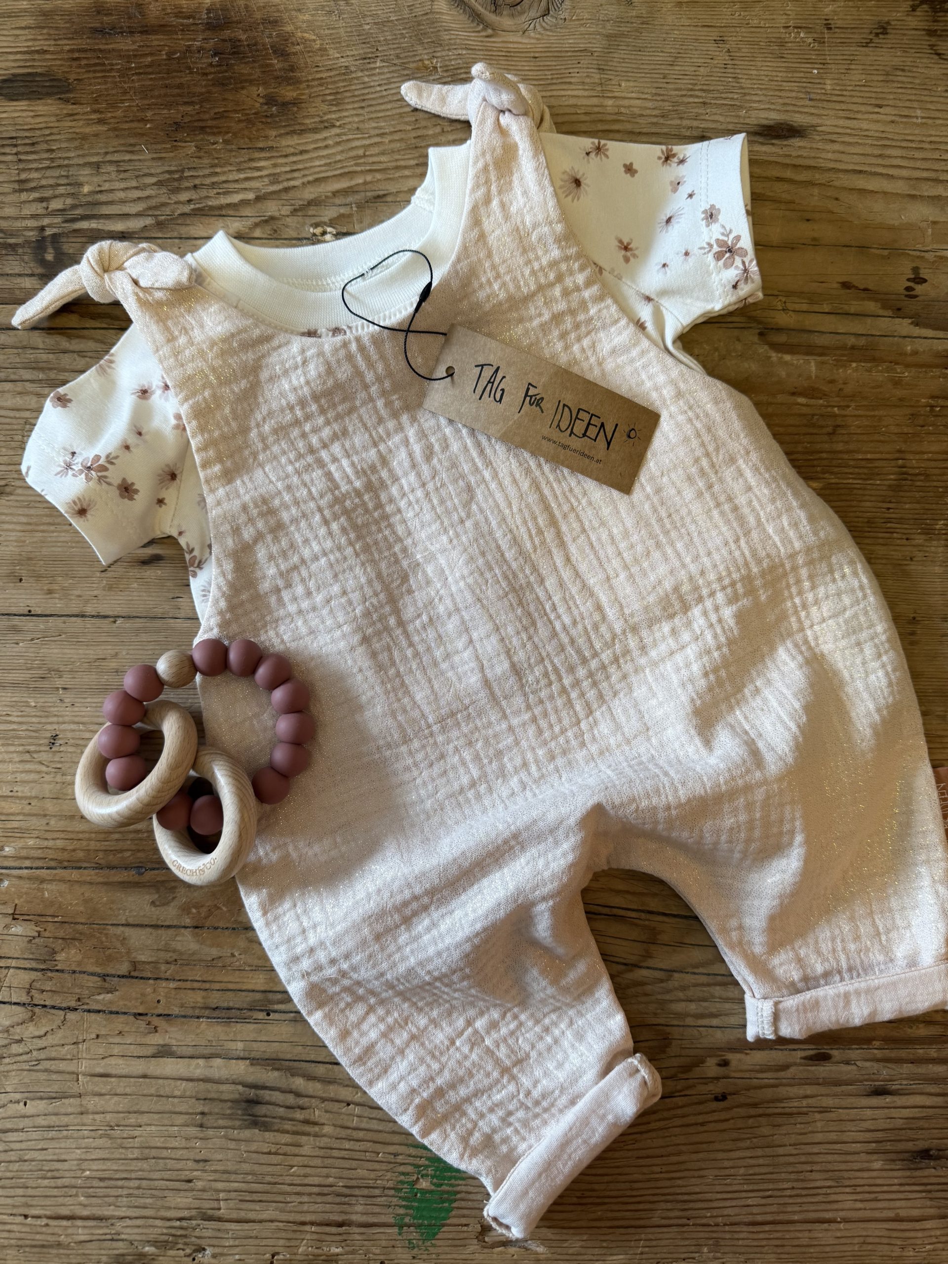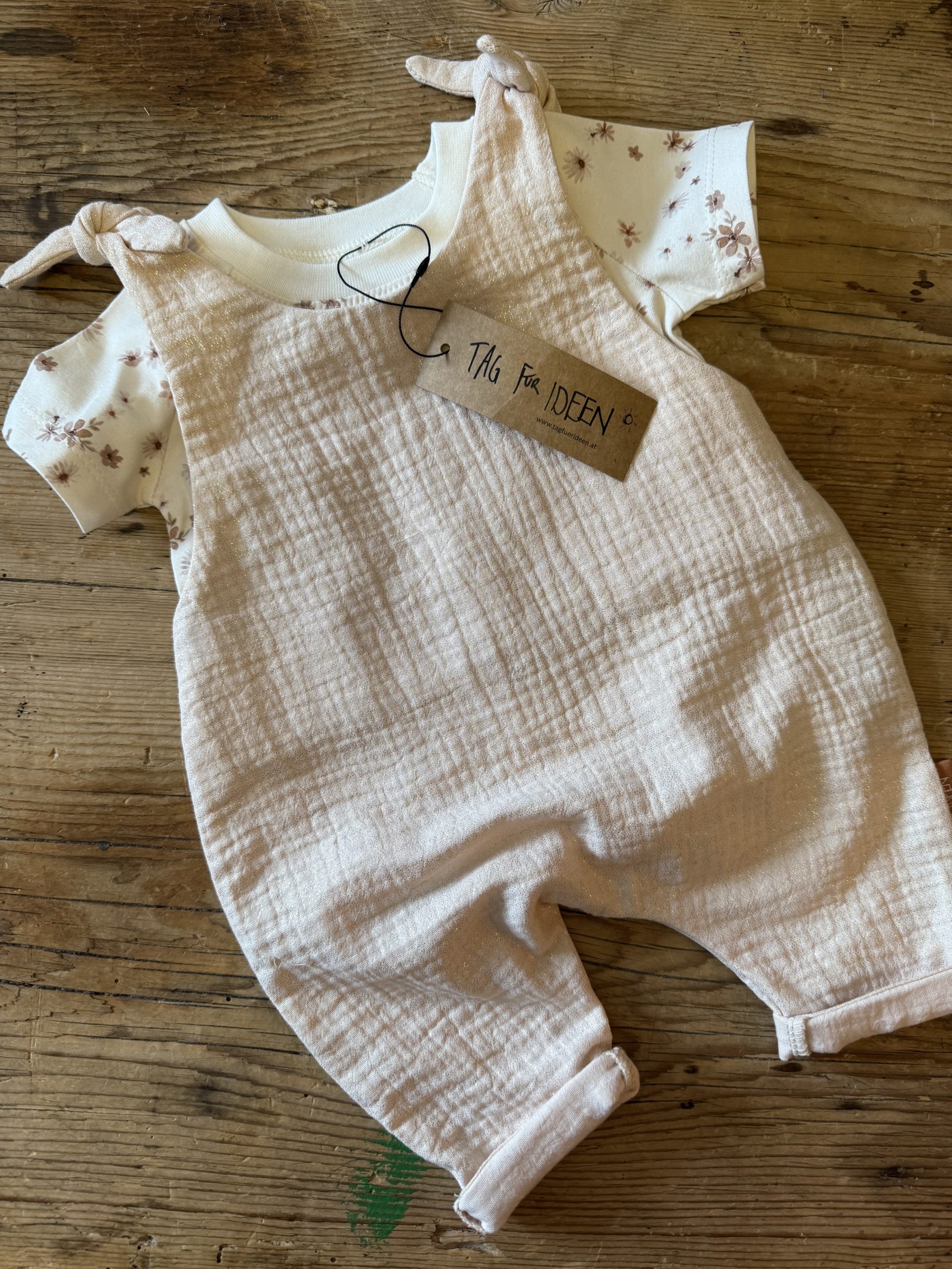 Pflege: 30°C Feinwäsche, bitte den Musselin-Romper auch nicht in den Trockner geben, da das Kleidungsstück sonst extrem eingehen würde.